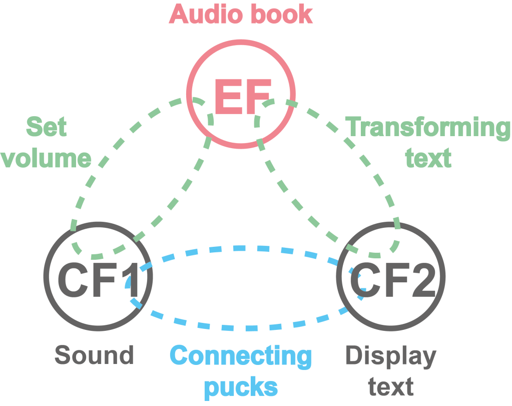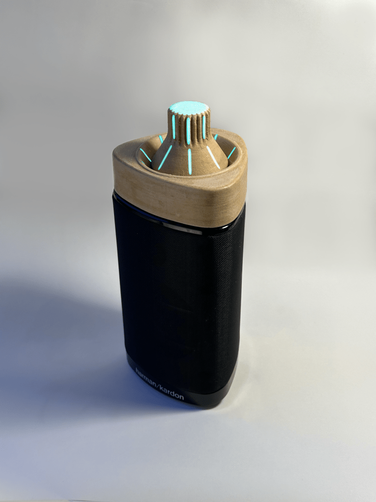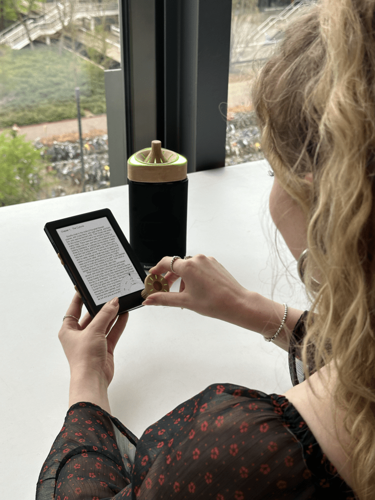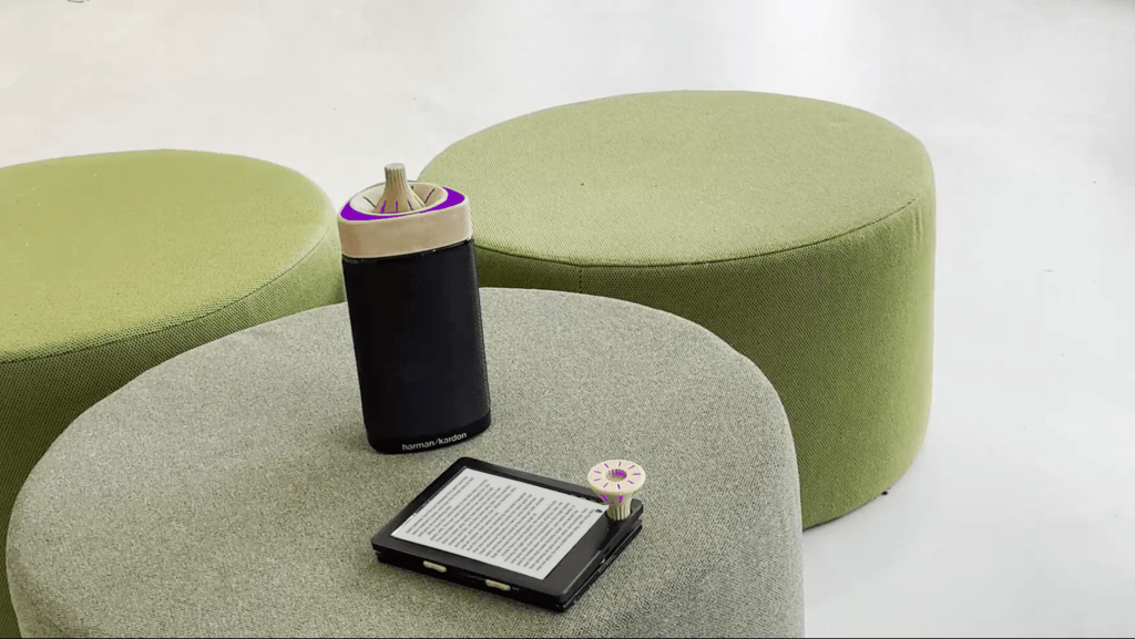 The starting concept responds to the inconveniences and struggles of connecting devices by Bluetooth. The system uses pucks to connect your devices by keeping them against each other while the pucks light up in the same colour. One puck is put on the audio source and the other on the speaker and both devices “absorb” the colour, showing the mutual connection. In the second the system is an e-reader in which we included the physical book experiences of physicalising progress overview, turning pages and the ritual for choosing a physical book. By connecting the two systems through audiobooks, the e-reader becomes an audio source after inserting the puck. This merging combination of books and audiobooks is a concept envisioning entertainment meeting convenience.
