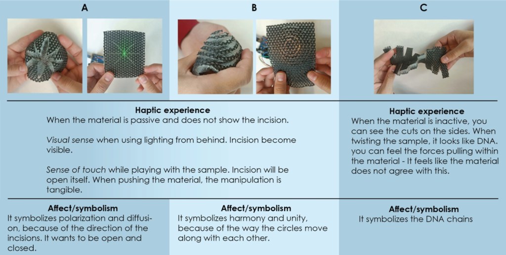 PHEID, Playful Haptic Experiences through Interactive Design, is a design that slowly invites you to touch and get acquainted with the patterns hidden in the material and followed by applying more intensive pressure to them. The texture and the elasticity of the material invite the user to touch or press the interface material which transfers the detection into an action on a Feelix motor which rewards you with a contra-pressure that can vary depending on the direction received. Thanks to gradually intensification, a playful relationship with PHEID is created.